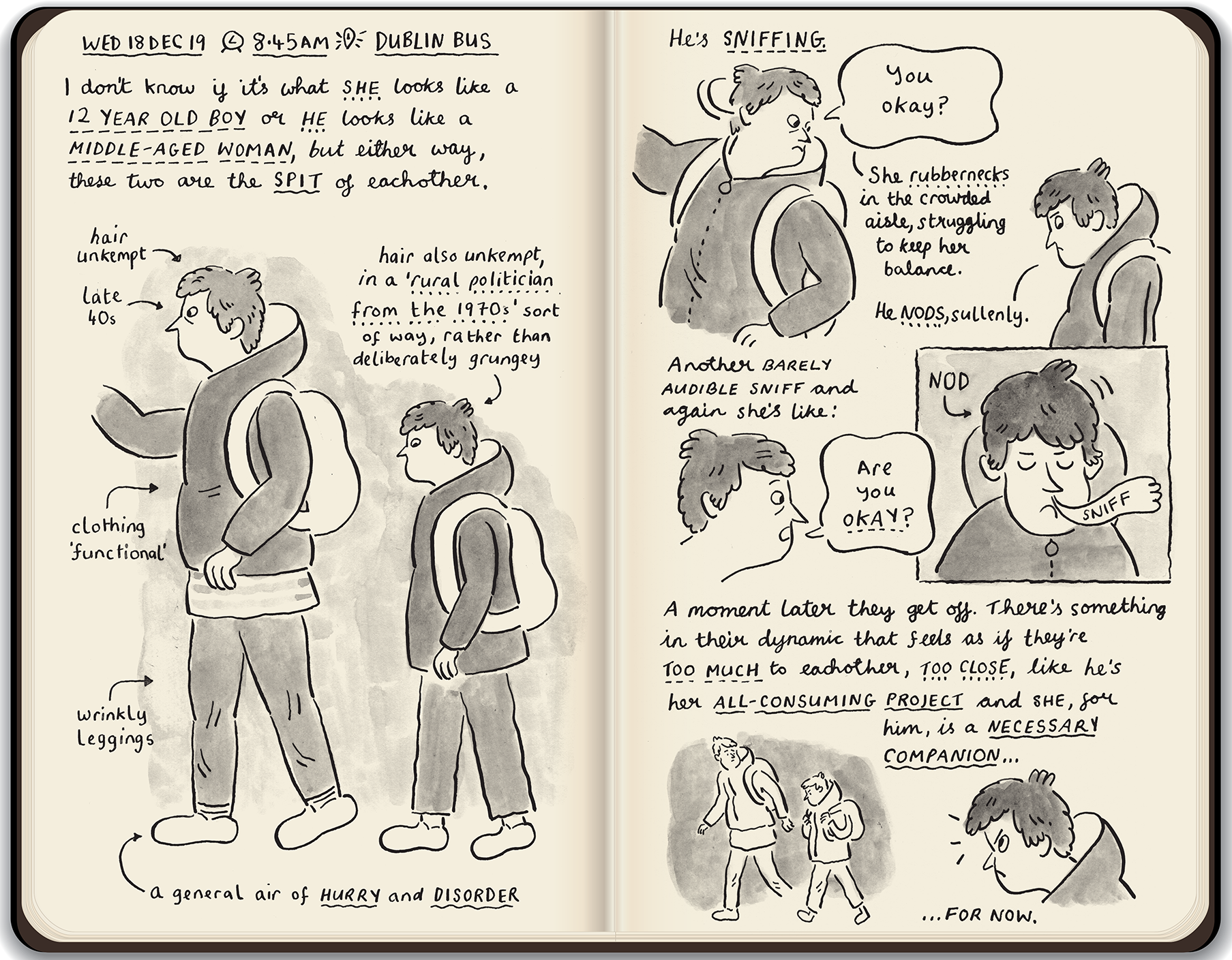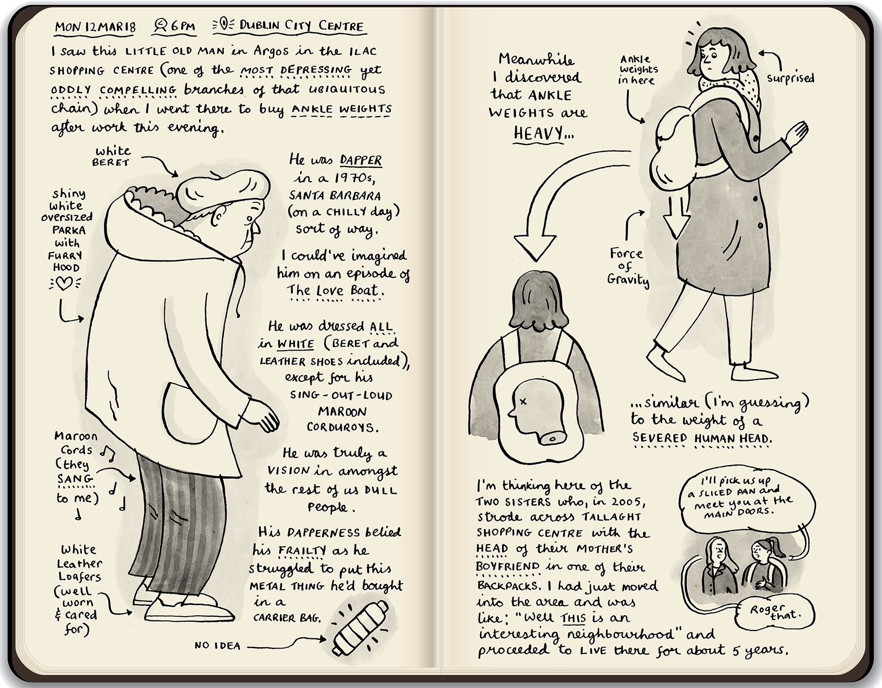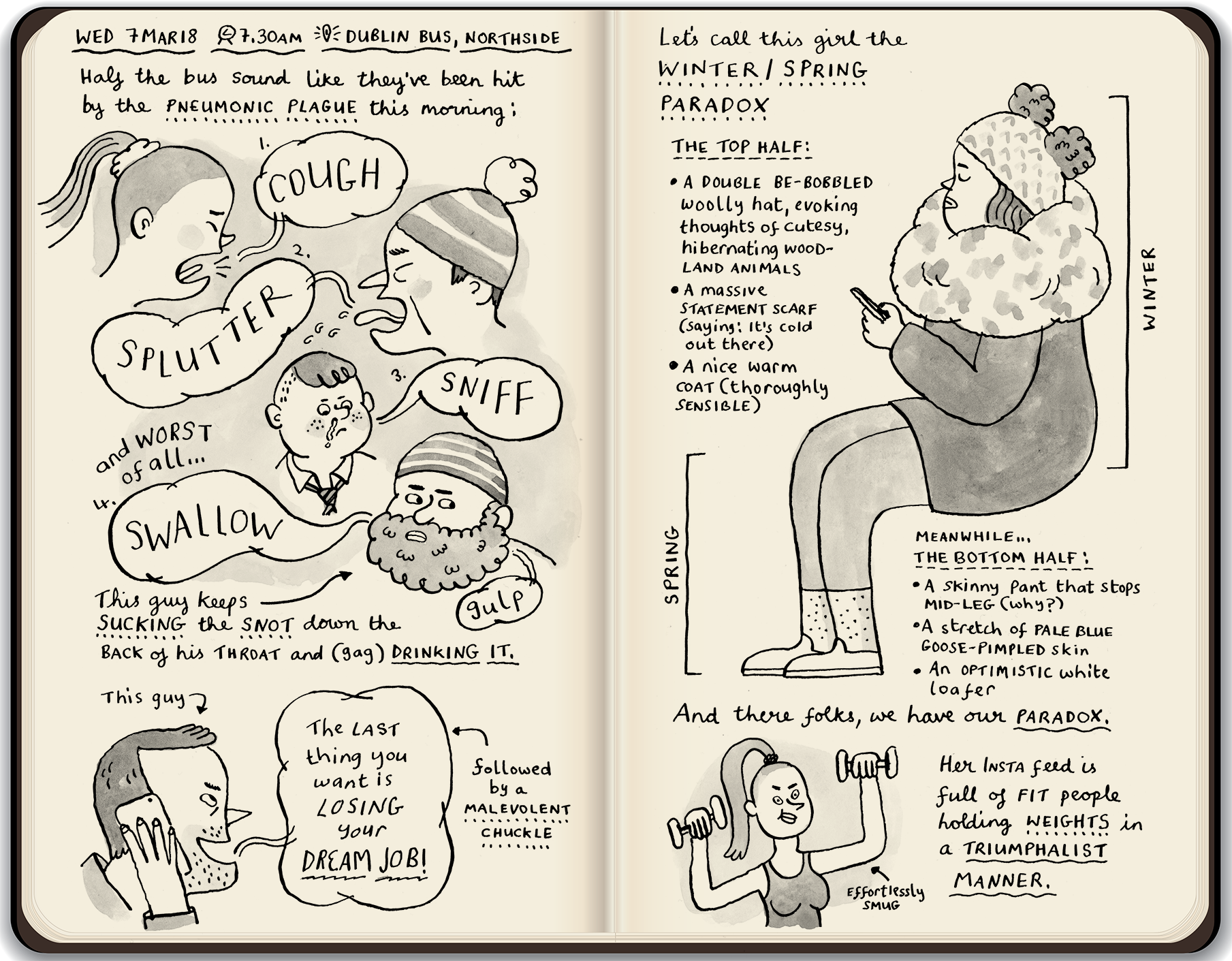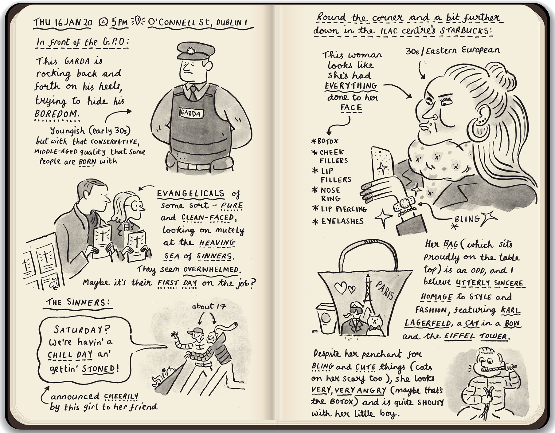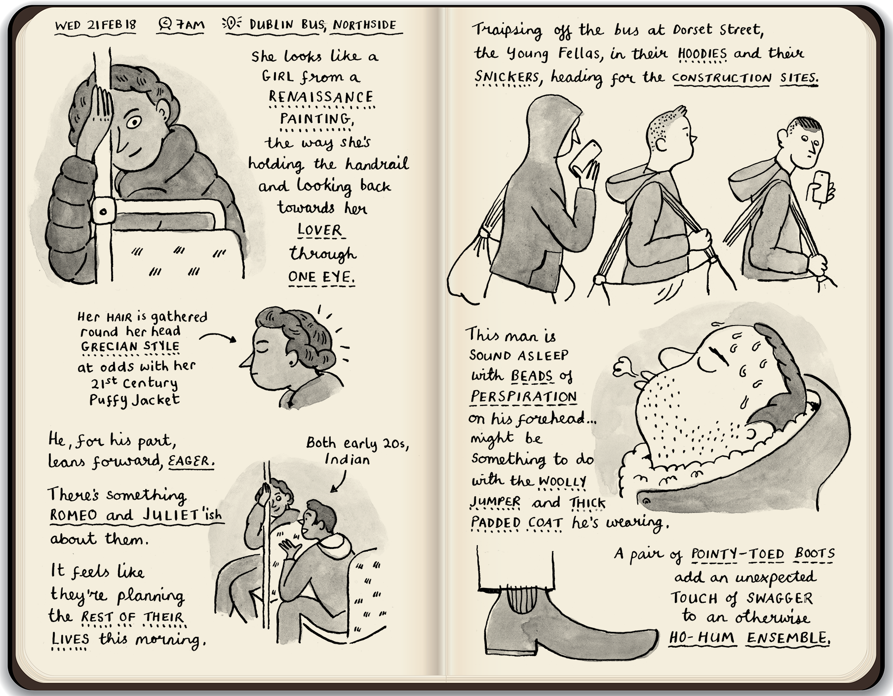 Here's a selection from my urban diary series that ran from 2017 till the outbreak of the pandemic in 2020. Based in Dublin City, it recorded observational snippets from my daily commute, coffee shops, shopping centres and more. Check out my Instagram for the full archive.