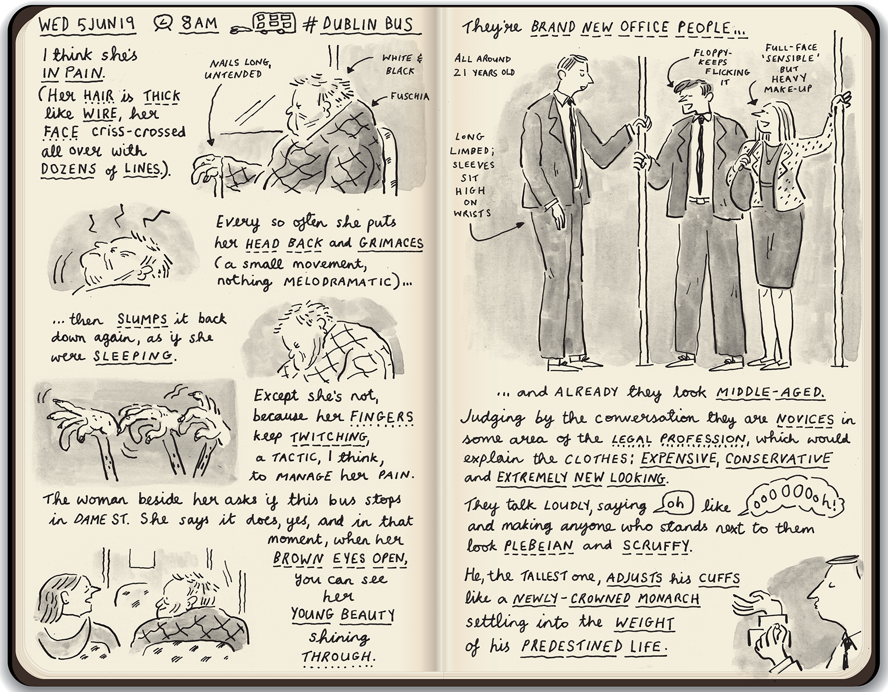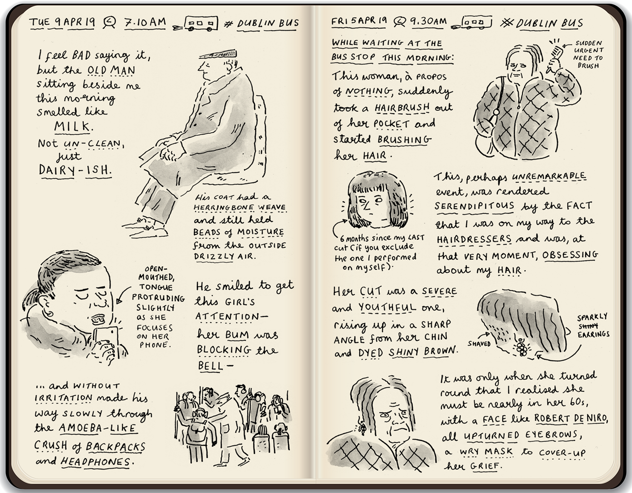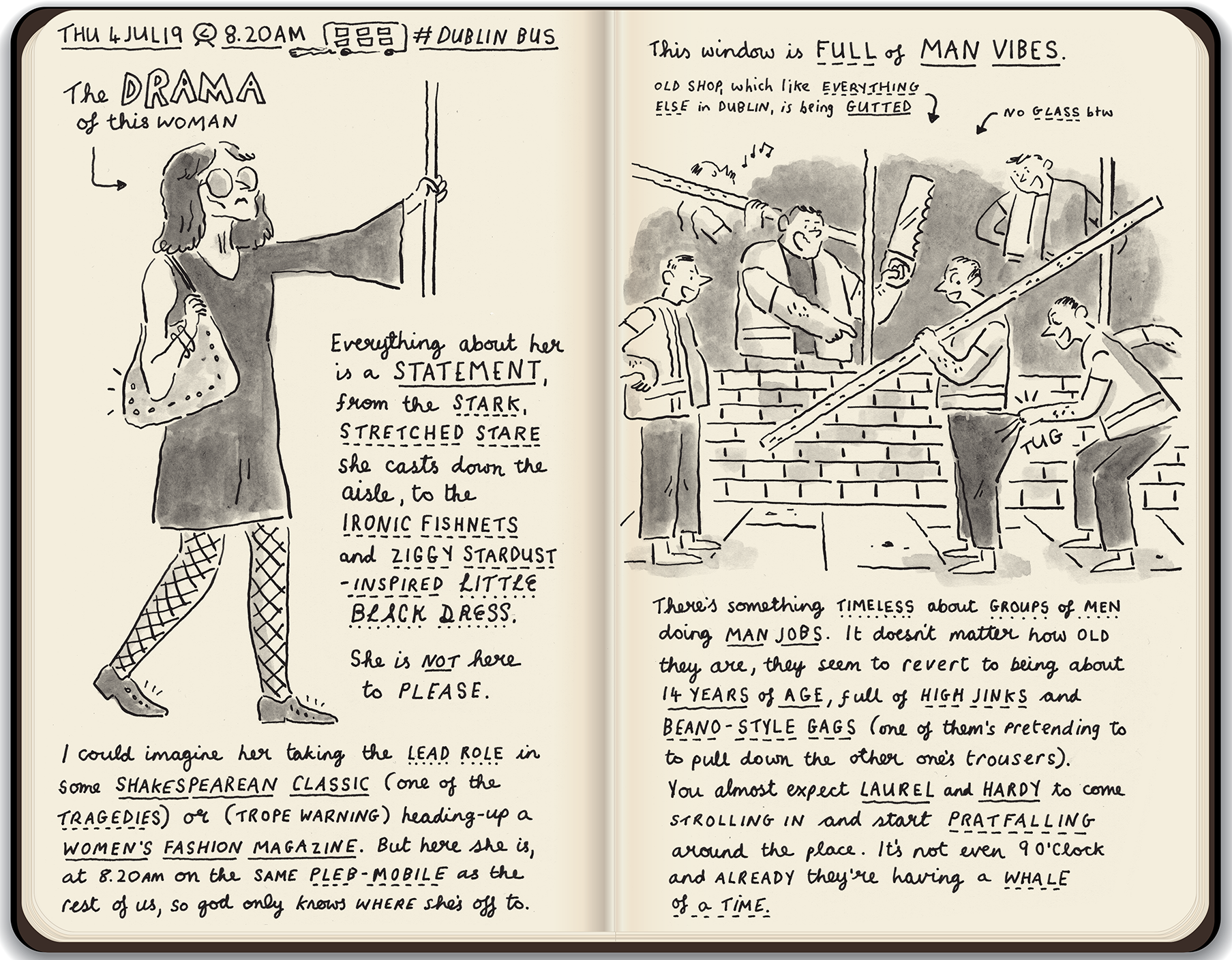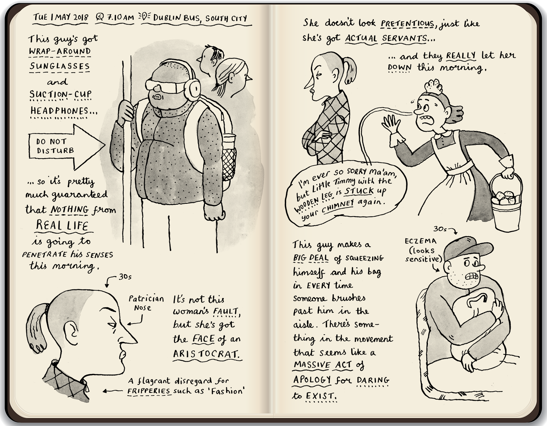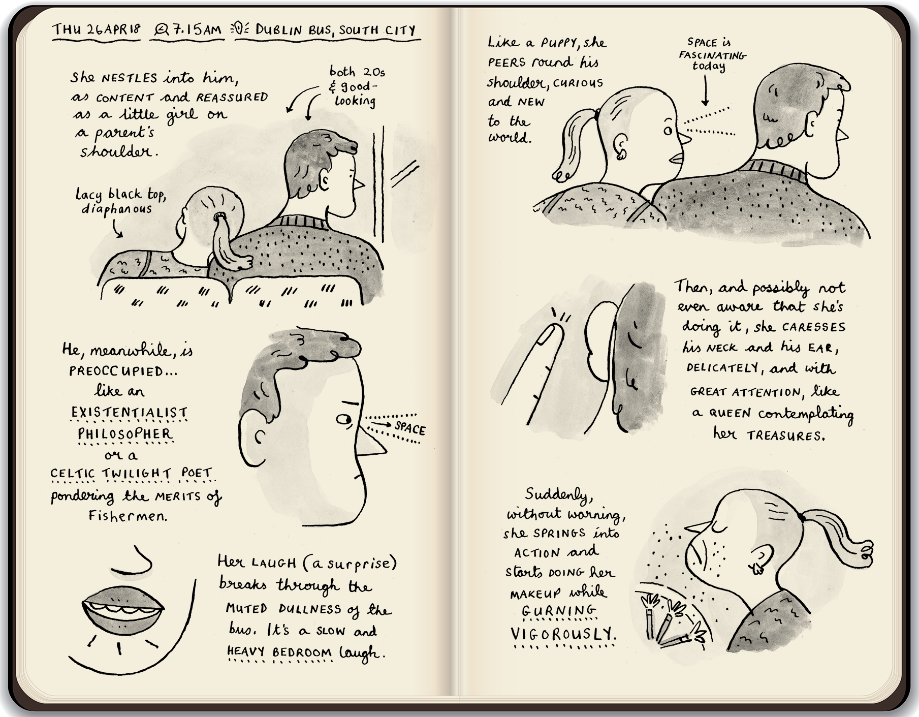 Here's a selection from my urban diary series that ran from 2017 till the outbreak of the pandemic in 2020. Based in Dublin City, it recorded observational snippets from my daily commute, coffee shops, shopping centres and more. Check out my Instagram for the full archive.