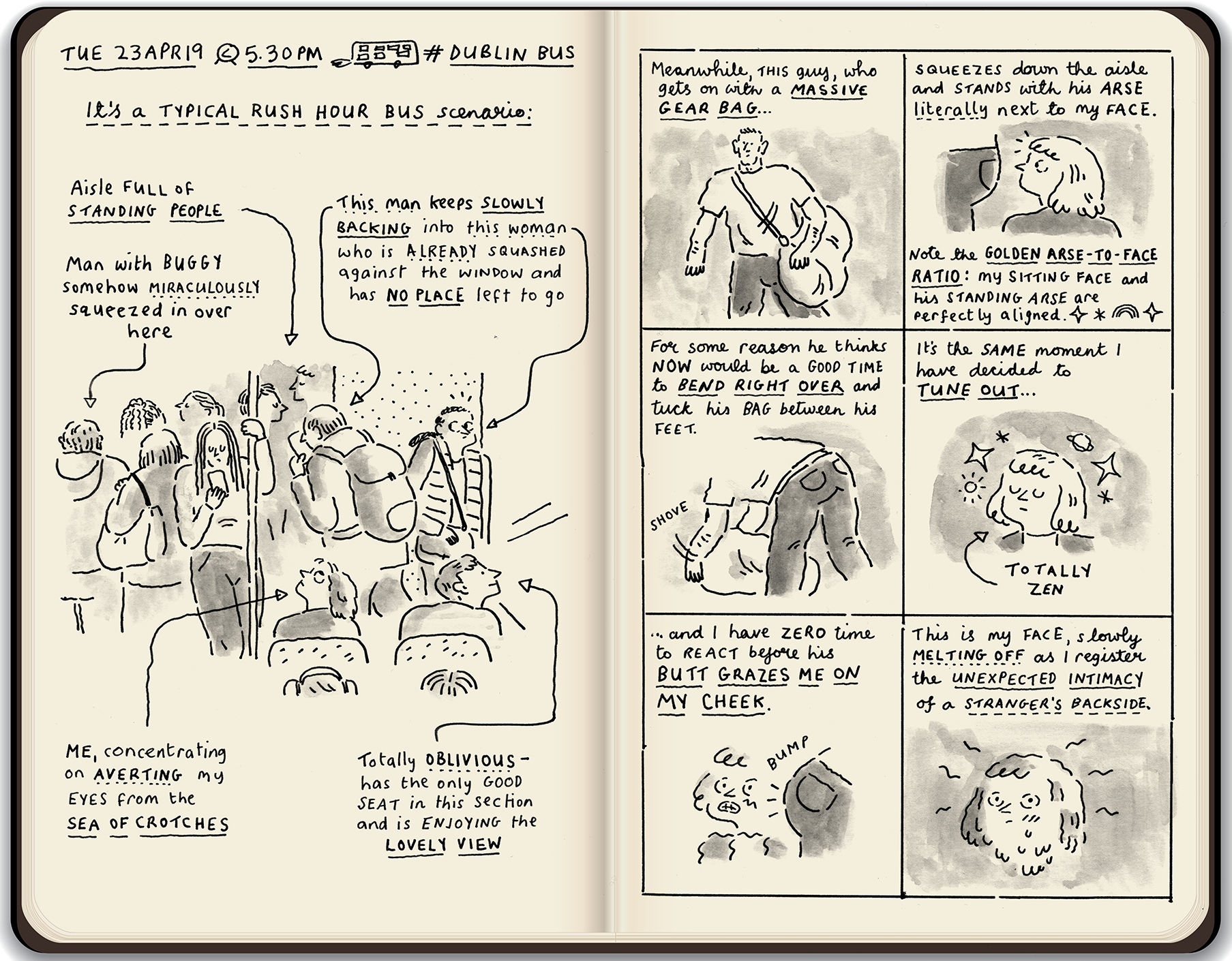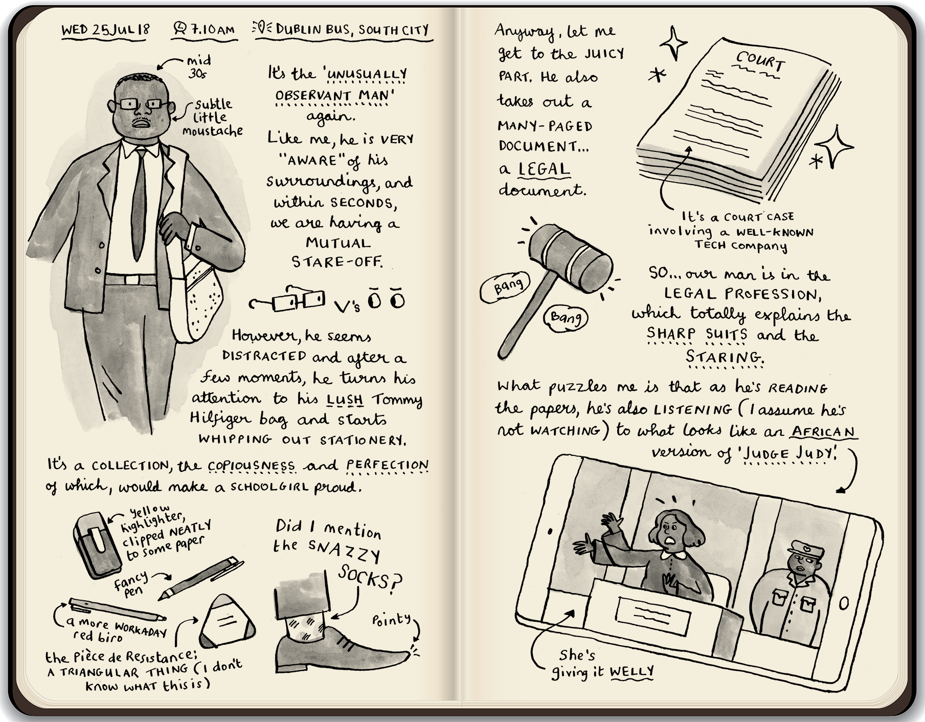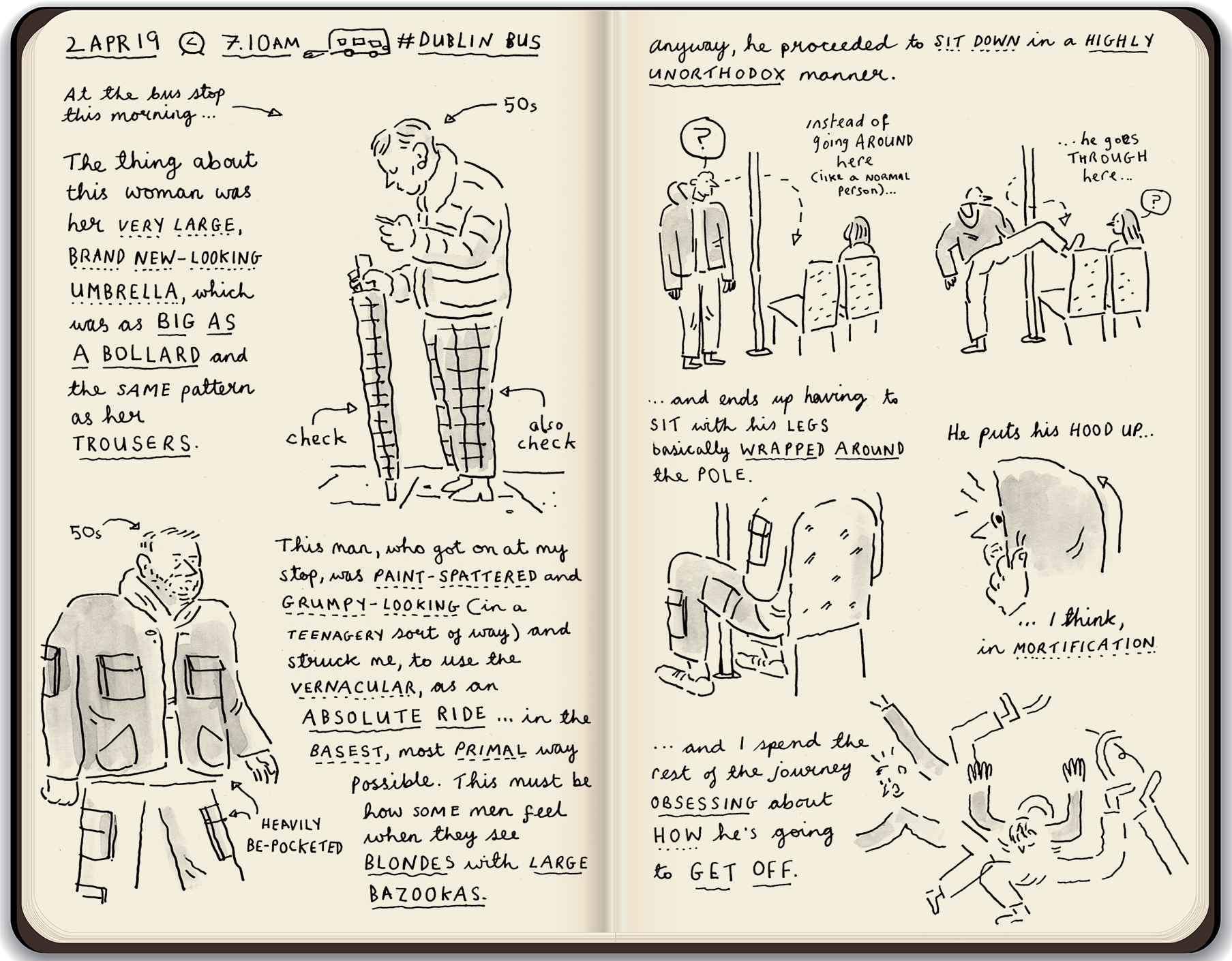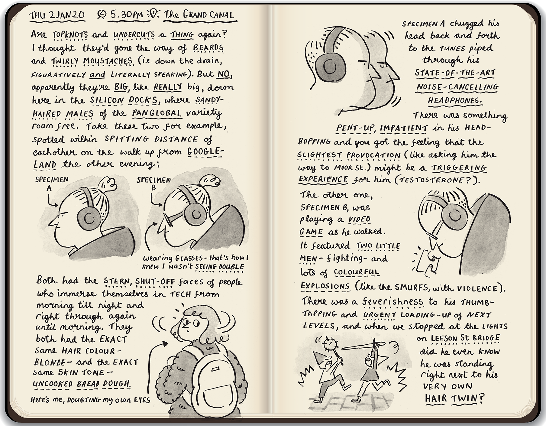 Here's a selection from my urban diary series that ran from 2017 till the outbreak of the pandemic in 2020. Based in Dublin City, it recorded observational snippets from my daily commute, coffee shops, shopping centres and more. Check out my Instagram for the full archive.