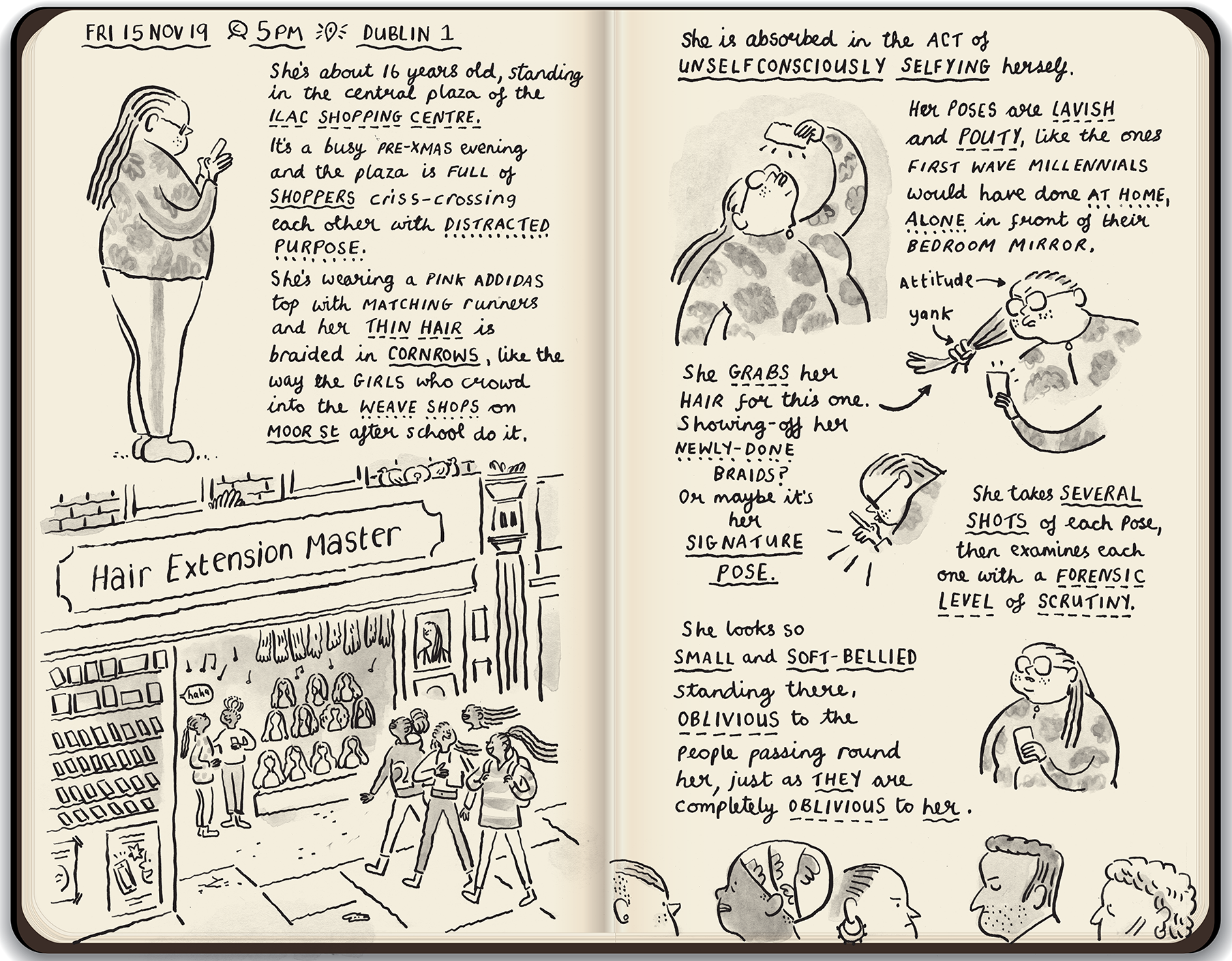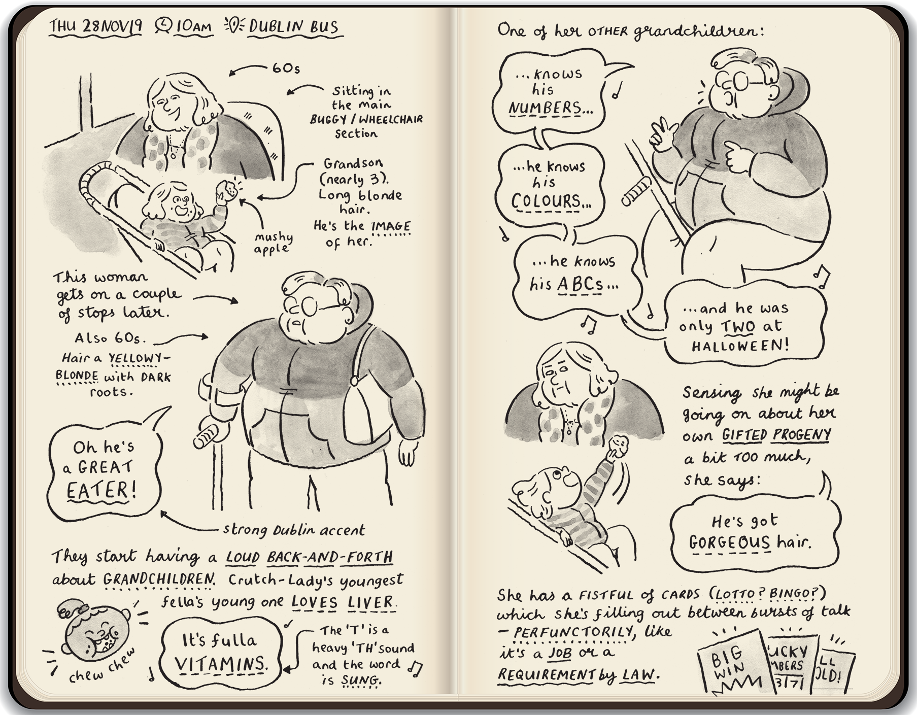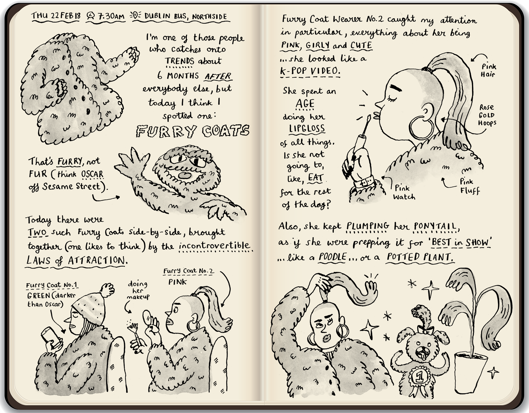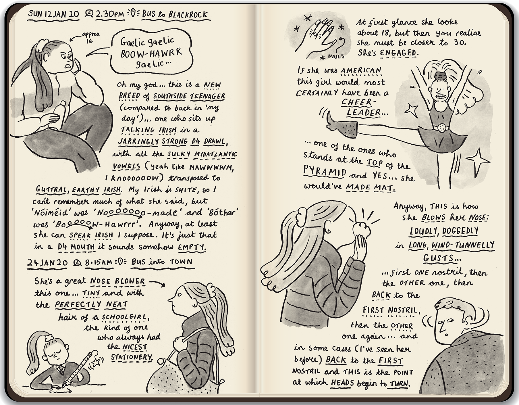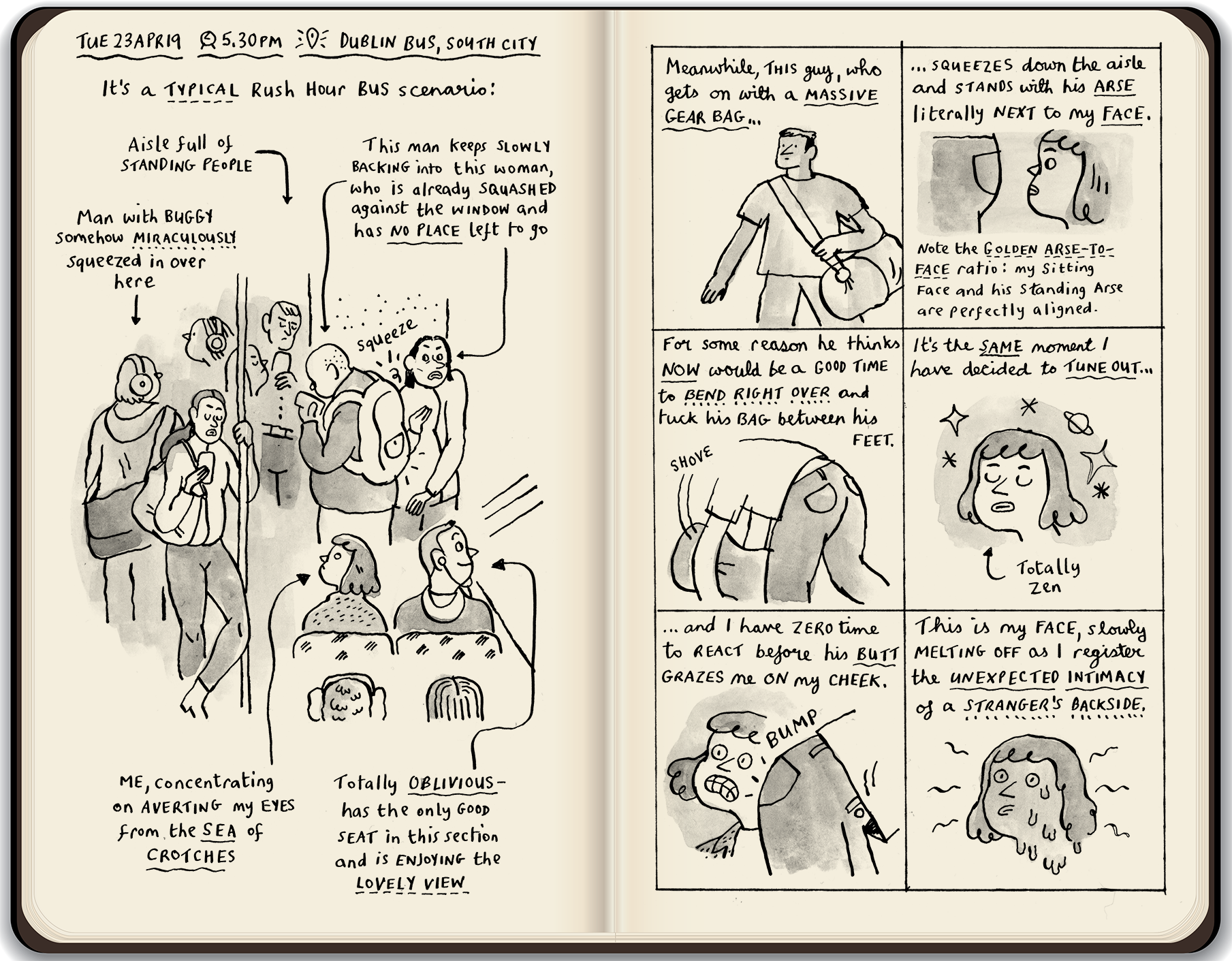 Here's a selection from my urban diary series that ran from 2017 till the outbreak of the pandemic in 2020. Based in Dublin City, it recorded observational snippets from my daily commute, coffee shops, shopping centres and more. Check out my Instagram for the full archive.